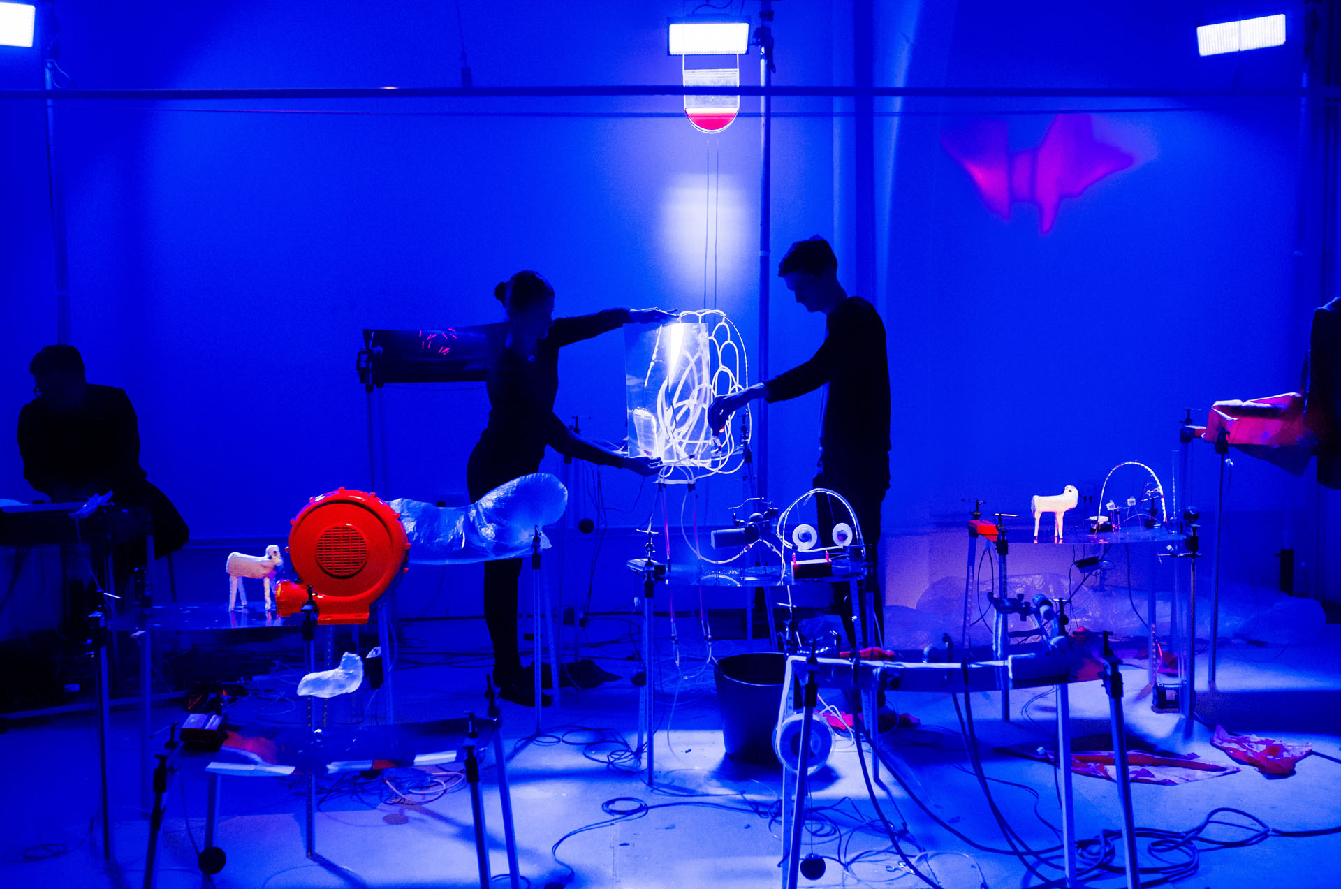 The Assembly of the Animals, on the other hand, seemed like the opposite of clownish, to begin with at least. A small group of us were ushered into a long, low-ceilinged, dark room in the upper part of the Vaults, and seated in front of rows and rows of curtains. The first of these opened to show a table full of rickety scientific-looking equipment, which a man and woman in white coats began tinkering with. Various magnetic contraptions, inflating tubes and lumps of wax got moved around, nothing quite seeming to have an actual purpose, beyond sometimes making wonky sheep-like model animals move around the tables.